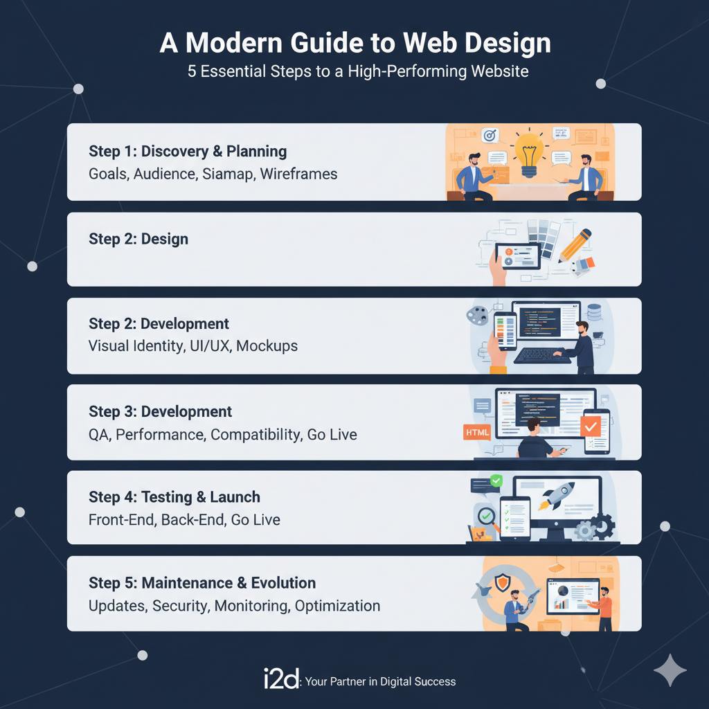 But how does a great website come to life? It’s not magic; it’s a journey that is planned and done with others. This guide will show you the five main steps that make up the modern web design process. If you know these steps, you’ll be able to work well with a design agency and make sure the final product meets your business needs.